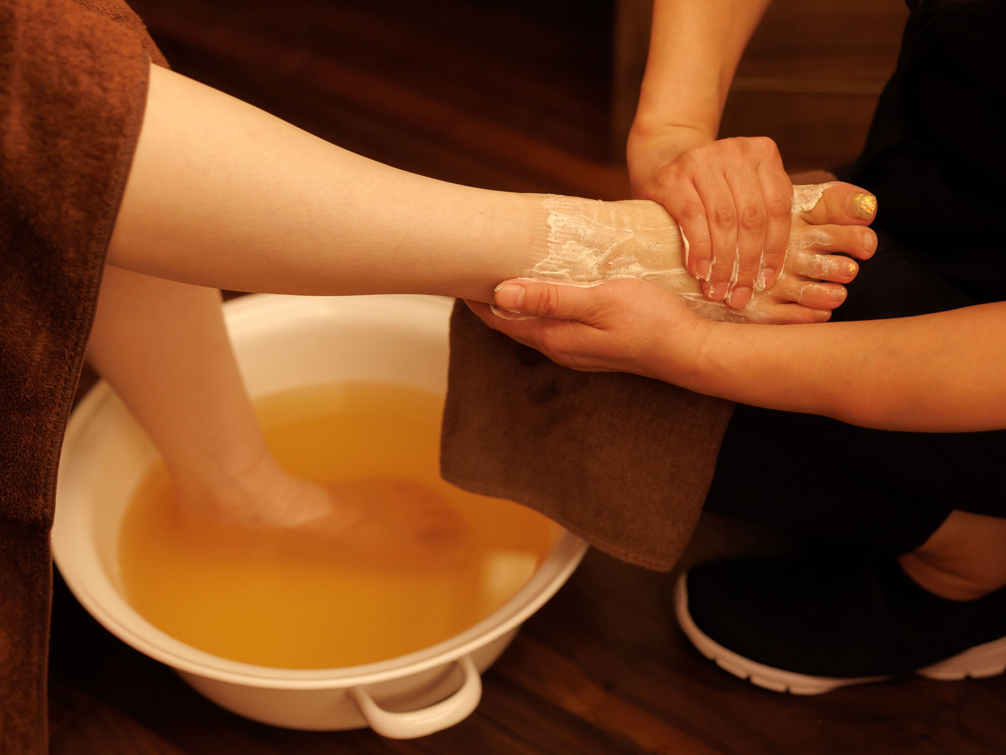 従来のハーブフットバスに加えて、アンズスクラブを使用し、お足元を優しくほぐします。